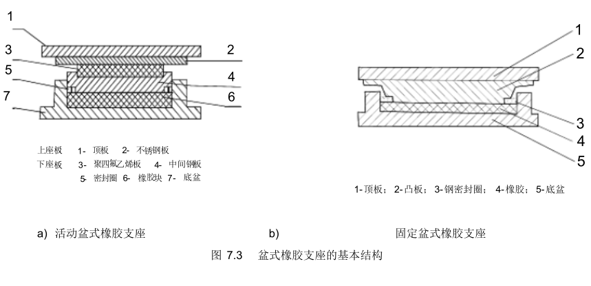 盆式橡胶支座亦分为活动盆式橡胶支座和固定盆式橡胶支座。 活动盆式橡胶支座的基本结构一般可分为上座板和下座板 ( 见图 7.3a) 。上座板由顶板和不锈钢板组成,上座板与桥的上部构造联结。下座板由底盆、橡胶块、密封圈、中间钢板、聚四氟乙烯滑板组成,下座板固结在桥墩上。 不锈钢板与聚四氟乙烯板间摩擦系数很小, 可以实现梁的水平位移。 在转矩的作用下, 由于置于底盆内的橡胶块处于三向约束的状态, 此时它具有流体的性质, 故中间钢板顺利地随着上部构造而产生倾斜, 从而实现了梁端的转动。 底盆内的密封圈使橡胶受压后不致于从底盆中挤出。 固定盆式橡胶支座的构造与活动盆式橡胶支座相似, 但取消了实现水平位移功能的聚四氟乙烯滑板和不锈钢板,其构造见图 7.3b。